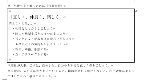 👆導入研修資料2ページ目の内容。会社の行動指針である「正しく、仲良く、楽しく」の意味をお伝えするページです。