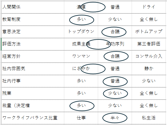 ①人間関係 ②教育制度 ③意思決定 ④評価方法 ⑤経営方針 ⑥社内の雰囲気 ⑦社内行事 ⑧残業 ⑨裁量(決裁権) ⑩ワークライフバランスの比重