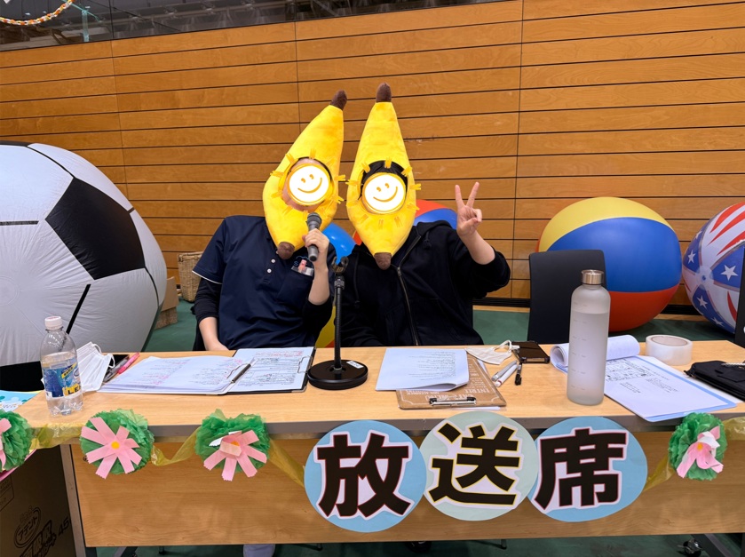 放送席にはバナナに扮した職員の姿が、、、!!!🍌
