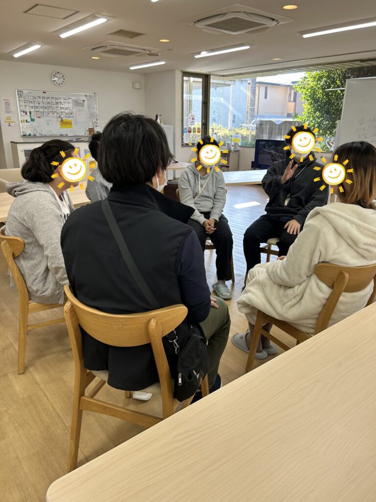 私も一緒に参加しやってみると以外と難しく、間違えそうになる場面があり、ご利用者様はリーダーの行動につられて発言とは違う行動をしてしまう方もいらっしゃいました。間違える事によりその場で笑いが起きて終始楽しく、雰囲気良く盛り上がってトレーニングをする事ができました。