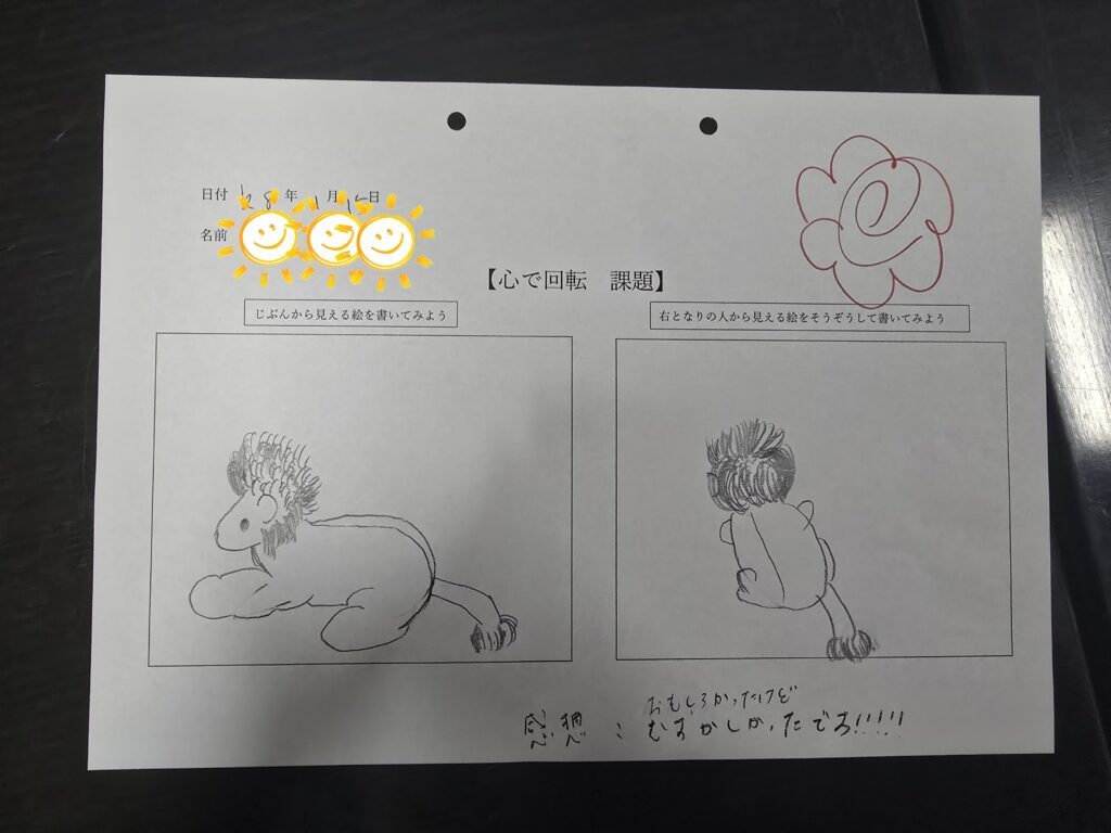 ぬいぐるみを机の中央に置き、利用者様に囲んで座っていただき、まず自分の視点で見えた絵を描いてもらいました。その後、右隣の人の視点を想像してもう一度描いてもらい、描画後に実際に右隣へ移動して、どのように見えるかを皆で確認しました。