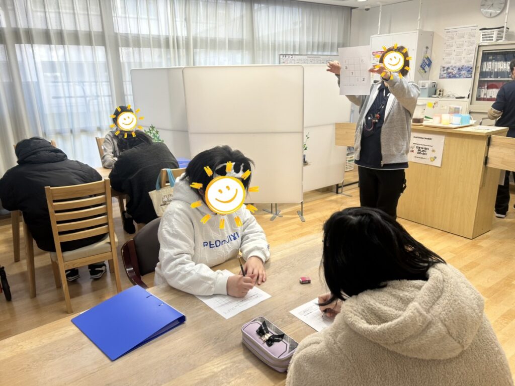 規定時間内に数字の配列を覚えて、シートに書き込む「数字はどこ?」では、視覚情報や数字に関する記憶得意な利用者様が多く、驚くほど正解率が高い様子が見られました!先生から覚える時のコツ(語呂合わせで覚えるなど)を学ぶ事で正解率をあげる利用者様もいました。