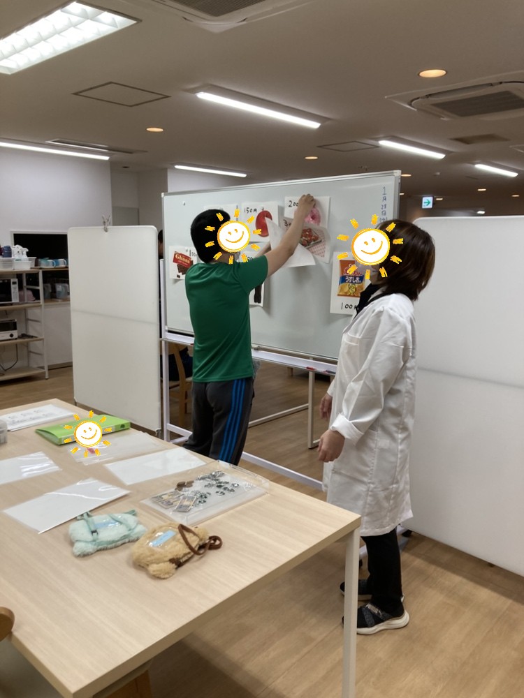 ③ ホワイトボードの商品(価格記載)を見て購入品を選ぶ。合計金額、購入しなくてはいけない物を考慮して選んでいただく。【短期記憶・注意力】