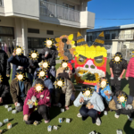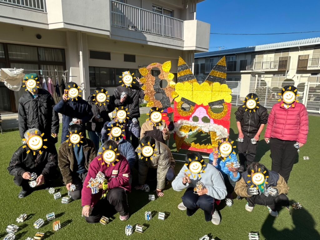青空広がる中庭にて、利用者様と走り回りながら笑い声たくさんで豆まきを行いました。