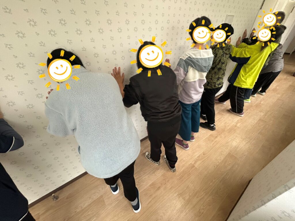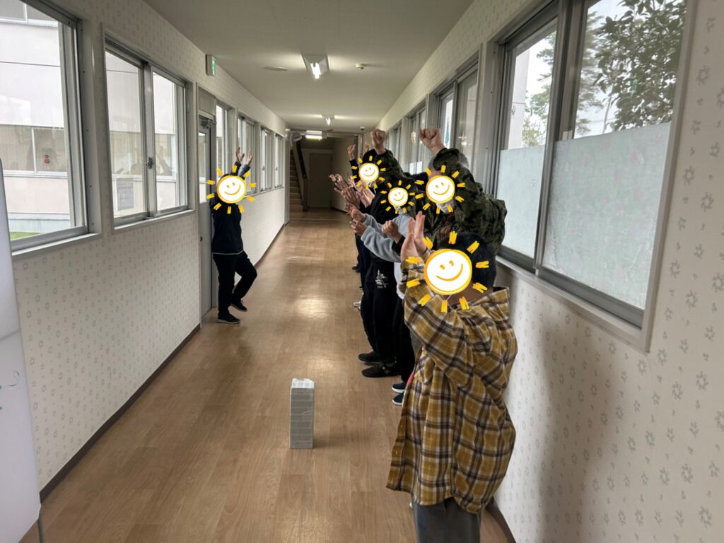 先日は雨が降っていたので、室内で廊下を活用し、集団歩行トレーニングを行いました!!