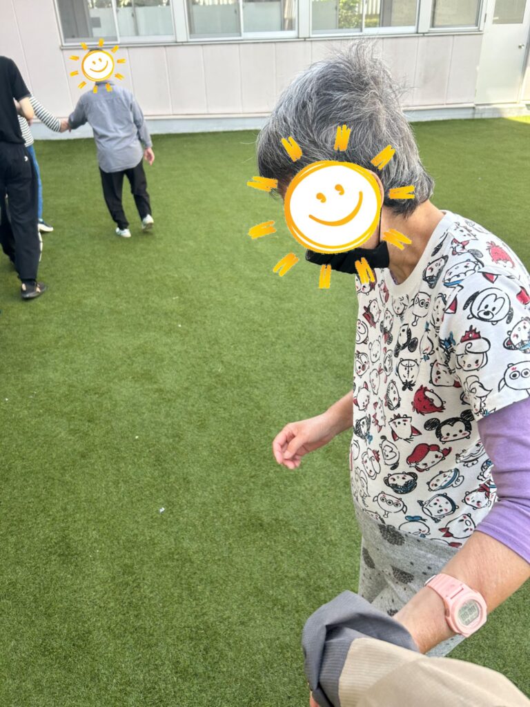また本日はS様が、普段シルバーカーをおしての参加なのですが『みんなみたいに手つないで歩いてみる』と、職員と一緒にシルバーカーなしの手繋ぎ歩行に参加してくれました!