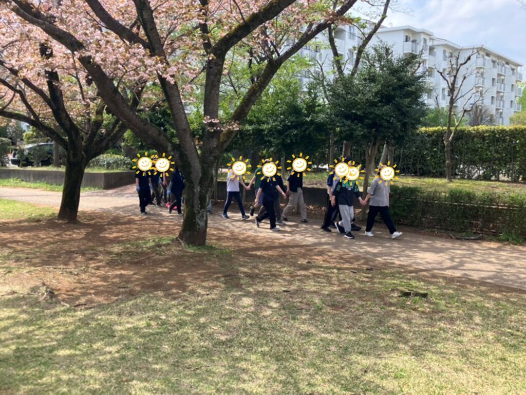 本日は心地よい環境の中、利用者様14名と戸外歩行へlet’s go!